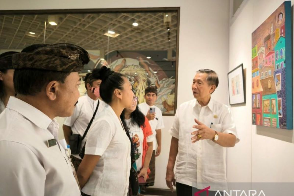 Anggota Dewan Perwakilan Daerah Made Mangku Pastika berbincang dengan Asisten Administrasi Pemerintahan dan Kesejahteraan Rakyat Setda Kota Denpasar I Made Toya dan aktivis Ni Luh Djelantik disela-sela acara pembukaan pameran kartun di Denpasar, Kamis (19/10/2023). ANTARA/Ni Luh Rhismawati.