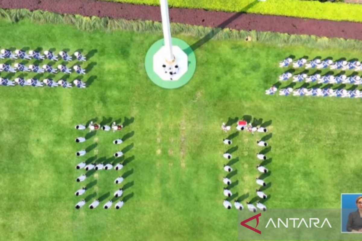 Sebagaimana dipantau dari tayangan langsung di kanal YouTube Sekretariat Presiden, Minggu, formasi angka "80" dibentuk ketika pasukan mengambil posisi di depan tiang bendera sebelum bendera Merah Putih dikibarkan.