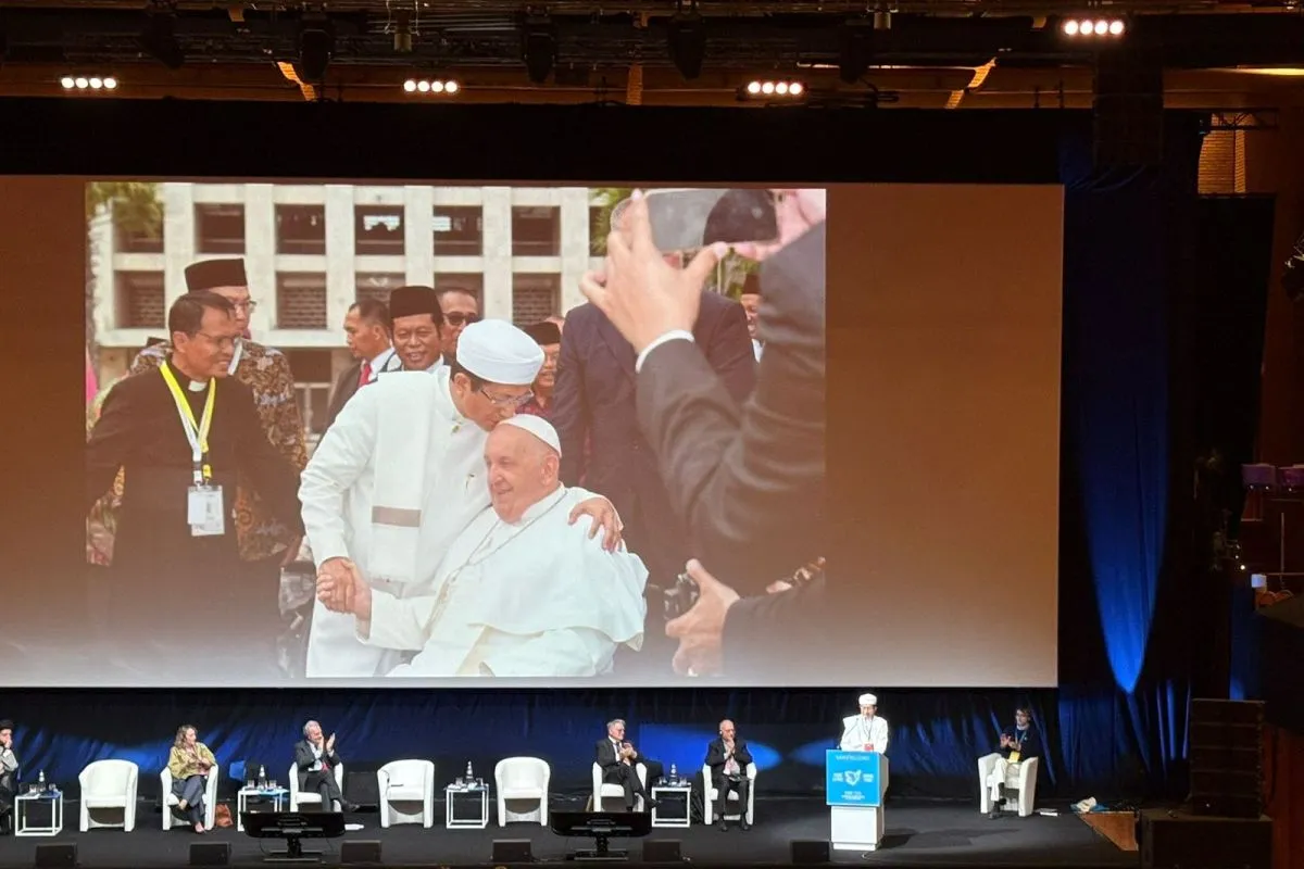 Bersamaan Menag mengenang persahabatannya dengan Paus Fransiskus, terpampang di layar, dua foto bersejarah. Foto Imam Besar Masjid Istiqlal mencium kening Paus Fransiskus dan foto Paus Fransiskus mencium tangan Imam Besar Masjid Istiqlal.