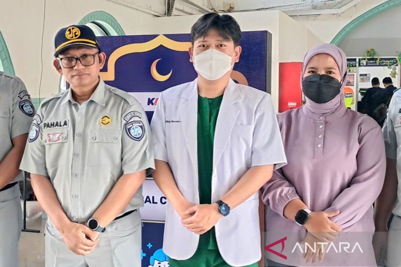 Dokter dari PT Jasa Raharja Jacky Harianto (tengah) saat ditemui di Stasiun Pasar Senen, Jakarta, Sabtu (29/3/2025). (ANTARA/Lintang Budiyanti Prameswari)