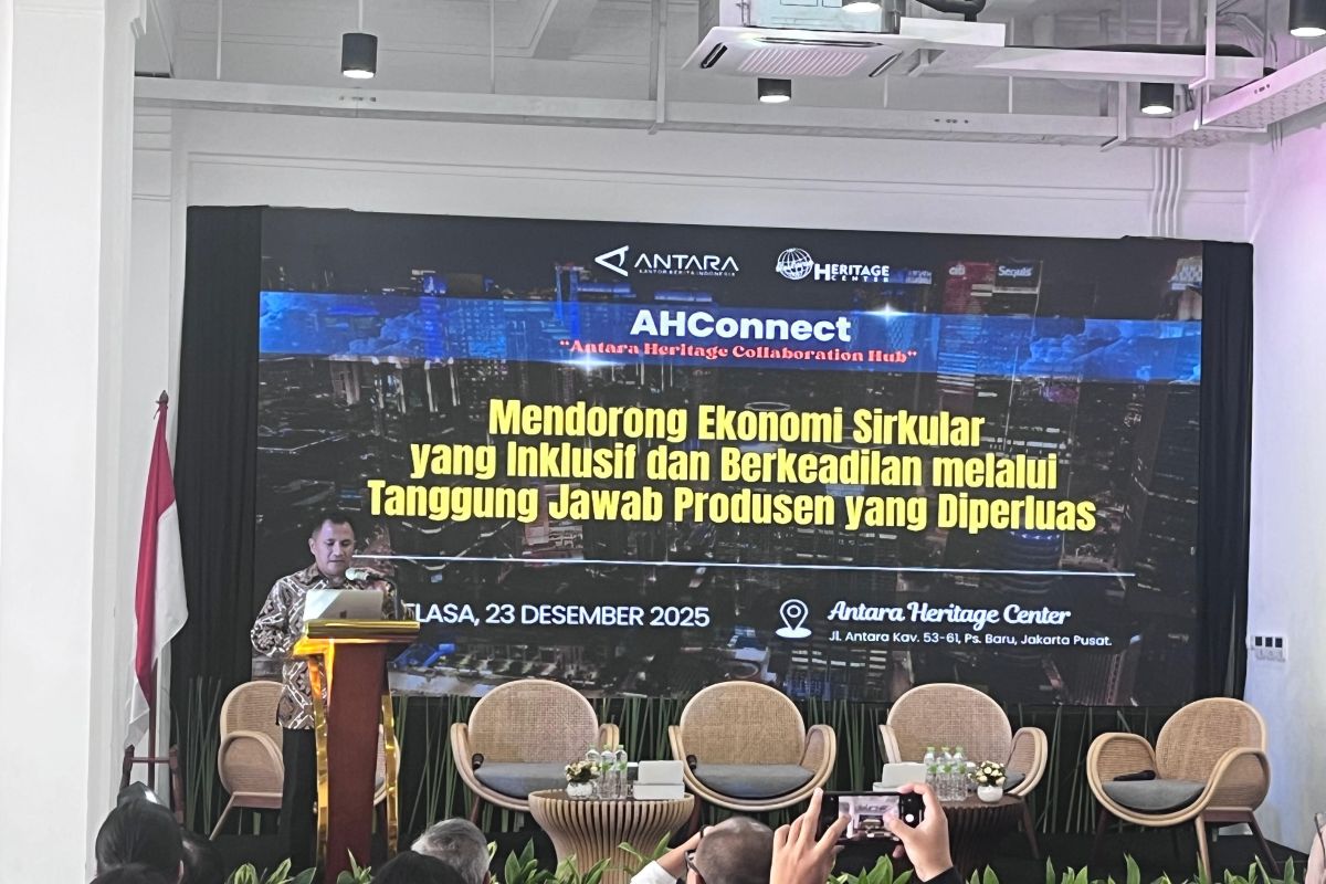 Deputi Bidang Pangan, Sumber Daya Alam, dan Lingkungan Hidup Kementerian Perencanaan Pembangunan Nasional (PPN)/Badan Perencanaan Pembangunan Nasional (Bappenas) Leonardo AA Teguh Sambodo dalam agenda “Talkshow Kolaborasi untuk Negeri: “Harmonisasi Regulasi Extended Producer Responsibility (EPR)” yang diadakan Lembaga Pendidikan ANTARA (LPA), di Jakarta, Selasa (23/12/2025). ANTARA/Muhammad Baqir Idrus Alatas