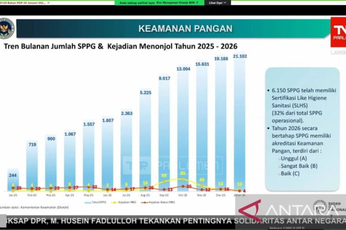 "Jumlah SPPG yang sudah SLHS itu mencakup 32 persen dan sedang dikejar agar bisa terus meningkat, dan tahun 2026 ini, selain ada SLHS, kita akan melakukan akreditasi dan sertifikasi," kata dia.