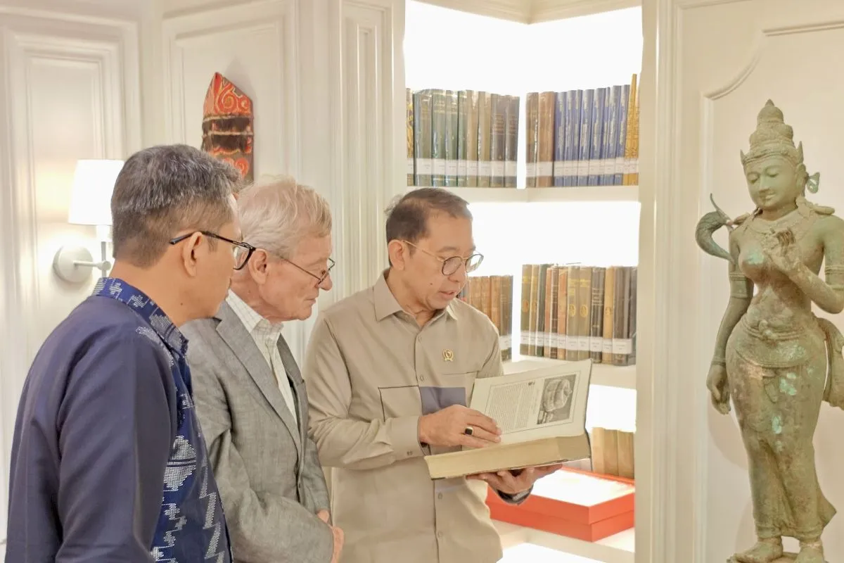 Menteri Kebudayaan Fadli Zon (kanan) memperlihatkan koleksi pribadinya berupa buku kepada kolektor barang antik Australia Michael Abbot (tengah) dan Kepala Museum NTB Ahmad Nuralam (kiri) di kantor Kementerian Kebudayaan RI, Jakarta, Rabu (18/2/2026). ANTARA/HO-Museum NTB