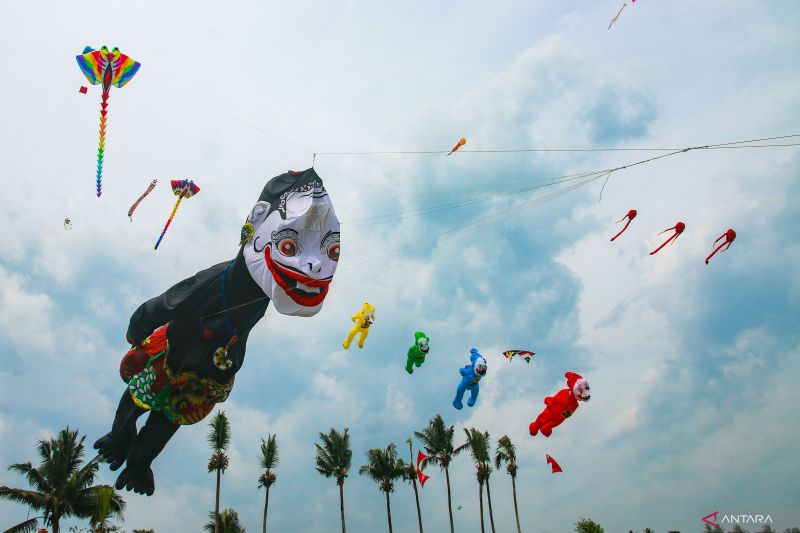 Sejumlah layang-layang bergambar berbagai karakter dan bentuk menghiasi langit saat Sleman Kite Festival #1 di Lapangan Tiban, Sendangmulyo, Minggir, Sleman, D.I. Yogyakarta, Minggu (5/10/2025). ANTARA/Rahid Putra Laksana