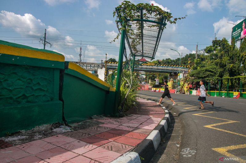 Anak-anak berlarian di sekitar Jembatan Kewek yang ditutup secara parsial, Danurejan, Kota Yogyakarta, Rabu (10/12/2025). Penutupan Jembatan Kewek mulai diberlakukan karena struktur jembatan dinilai dalam kondisi kritis. ANTARA/Rahid Putra Laksana