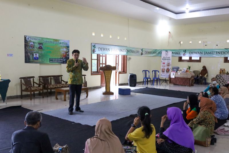 Bondan Agus Suryanto (72) memberikan materi tentang Seni Menyembuhkan Diri, RCI pada acara Festival Nitilaku Jamu di Balai Gading Sagan, Kota Yogyakarta, Daerah Istimewa Yogyakarta, Rabu (11/2/2026). ANTARA/Sayyida Nafisa